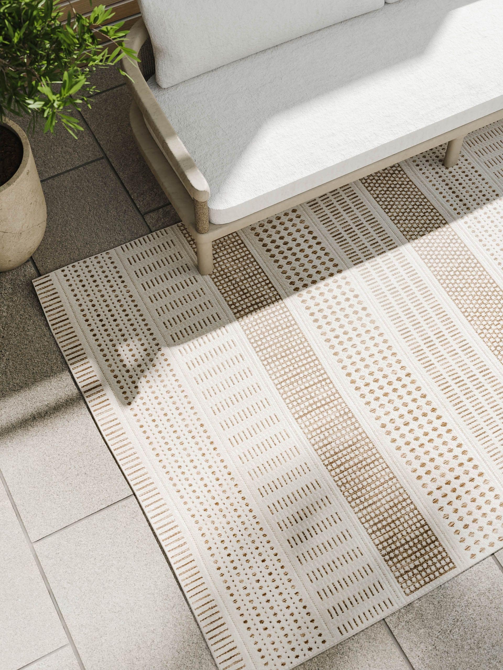 Outdoor Teppiche für den Camper - Definitiv gehören die Outdoor Teppiche von Benuta dazu. Wir selber haben auch einen Benuta Outdoor Teppich für unsere Campingreise im Wohnmobil zugelegt und das sogar in der Farbe weiß. Klar, dass der Teppich mit der Zeit seine Dreckspuren hat, schließlich wurde er oft auf einen matschigen und dreckigen Untergrund gelegt. Und nach der 6. Vermietung unseres Wohnmobils und unsere unzähligen eigenen Reisen haben wir den Outdoor Teppich zusätzlich noch mit roten Flecken zurückgekriegt. Zuerst war der Gedanke, dass der Outdoor Teppich ausgemustert werden muss. Bei den Pflegehinweisen wurde vom Hersteller aber auch beschrieben, dass man die Outdoor Teppiche auch mit einem Wasserschlauch abspritzen kann. Also haben wir uns einen nassen Lappen und Spülmittel an die dreckigen Stellen gemacht und tatsächlich ging alles ganz leicht weg. Es waren keine Flecken mehr übrig und der Outdoor Teppich war auch komplett wieder weiß. Das war der Moment ab dem der Outdoor Teppich von Benuta einfach perfekt für die Campingreise war. Die Kunststofffasern sind einfach ideal für die Outdoor-Nutzung. Ein Hingucker auf jedem Campingplatz.
