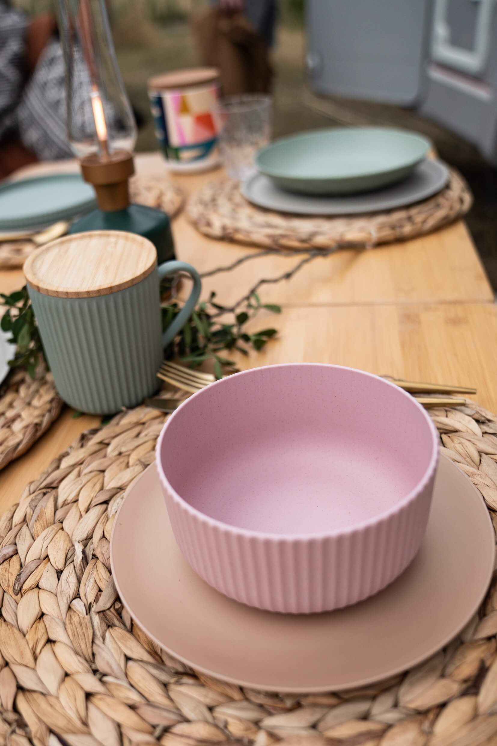 Neben den passenden Töpfen und Küchenhelfern sollte zu deinem Campinggeschirr natürlich auch Besteck, Teller sowie Gläser und Becher gehören. Dazu noch eine schöne große Schüssel für den Salat oder andere Beilagen und der Tisch sieht schon fast aus, wie man es auch beim gemeinsamen Essen zu Hause kennt.