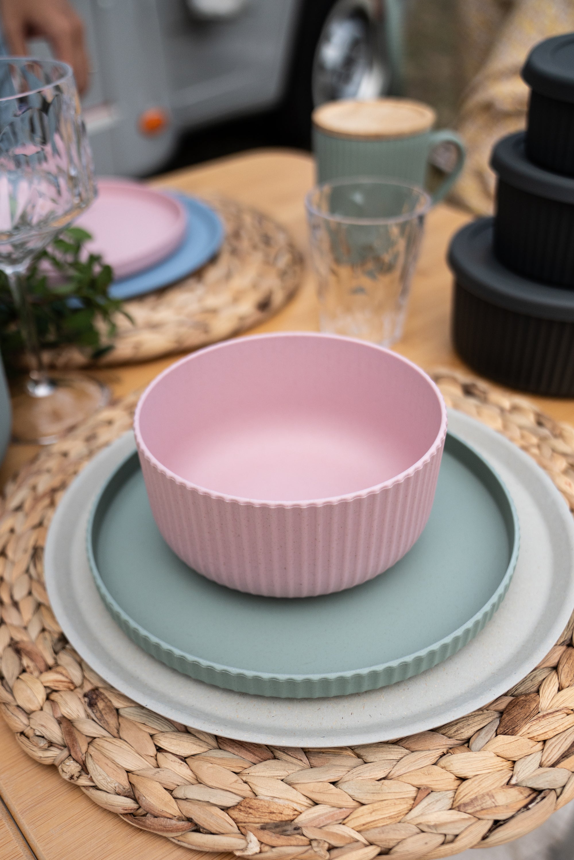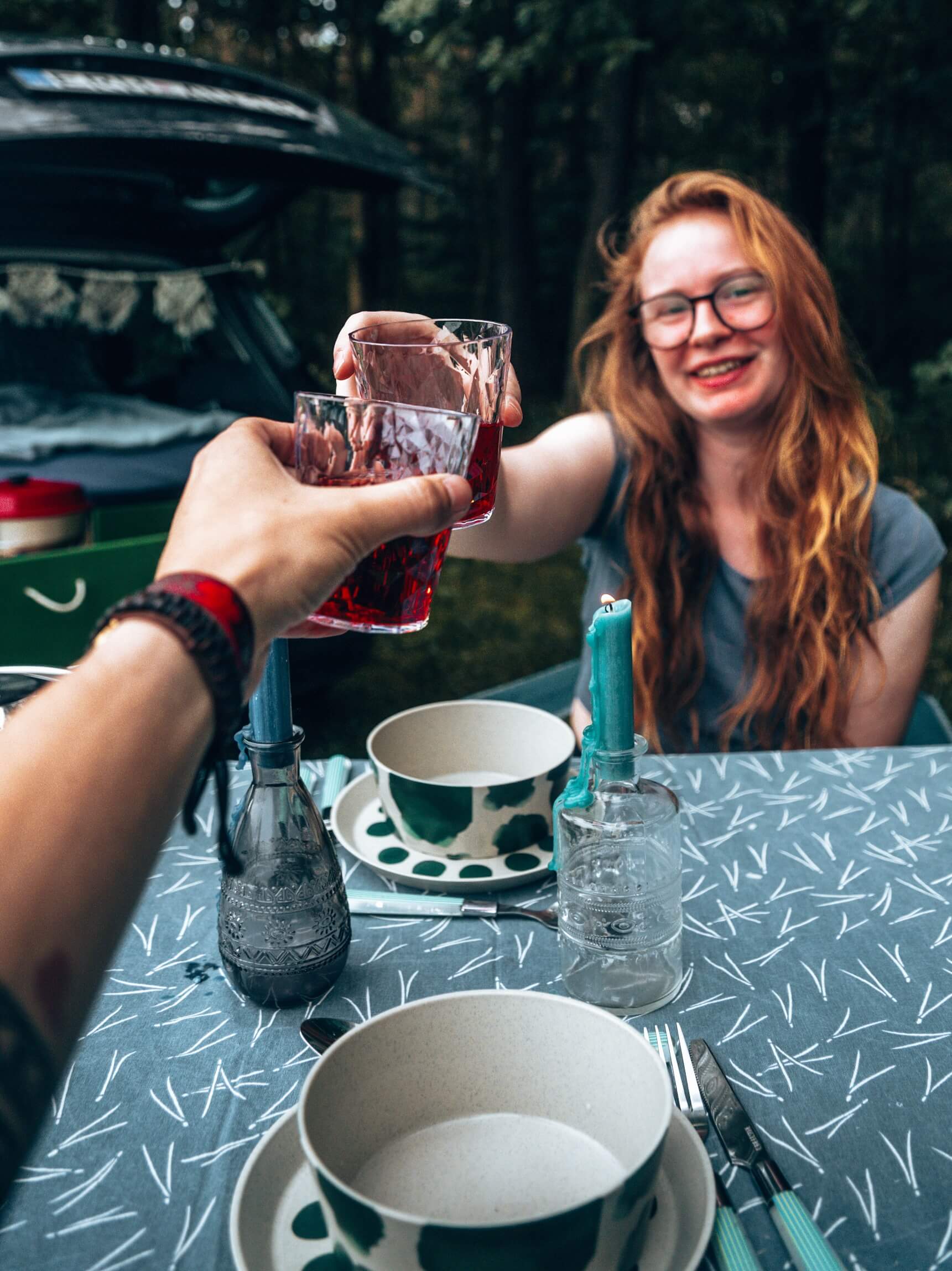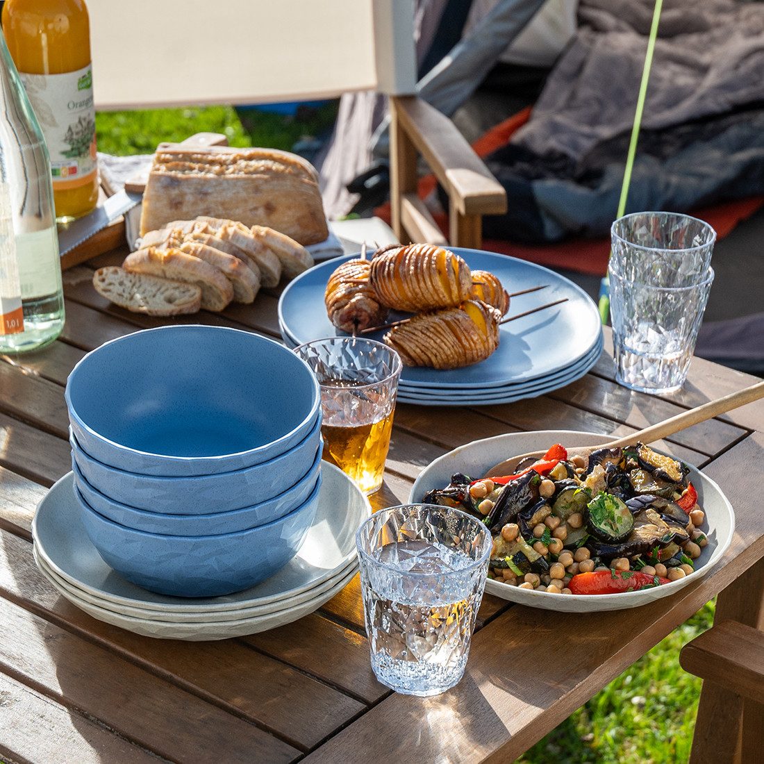Neben den passenden Töpfen und Küchenhelfern sollte zu deinem Campinggeschirr natürlich auch Besteck, Teller sowie Gläser und Becher gehören. Dazu noch eine schöne große Schüssel für den Salat oder andere Beilagen und der Tisch sieht schon fast aus, wie man es auch beim gemeinsamen Essen zu Hause kennt.